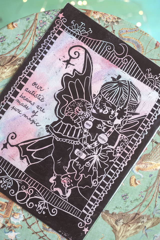 Linogravure sur aquarelle réalisée par mes soins "Our autistic brains are made of pure magic".