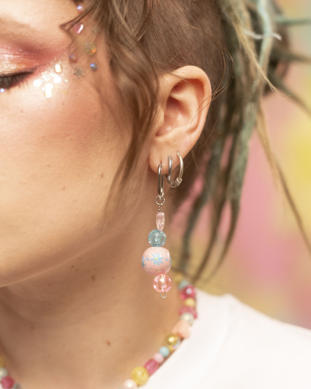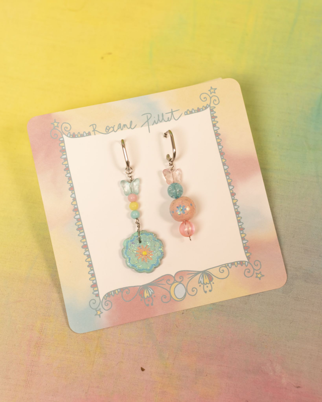 Boucles d'oreilles avec pendentifs faits main en argile autodurcissante, puis peints à la main et recouverts de résine epoxy. Les autres perles sont en plastique, et les montures (boucles,tige...) sont en acier inoxydable pour éviter les allergies et la rouille.Attention ces bijoux ne peuvent pas être mis sous l'eau à cause des parties réalisées en argile qui risquent de s'abimer!