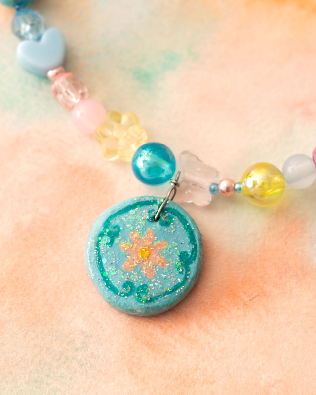 Collier en perles avec un pendentif et certaines perles réalisés en argile autodurcissante puis peint à la main avant d'être recouvert de résine epoxy. La chaine est les attaches sont en acier inoxydable pour éviter les allergies et la rouille. Attention, il ne peut pas être mis sous l'eau à cause du pendentif en argile!